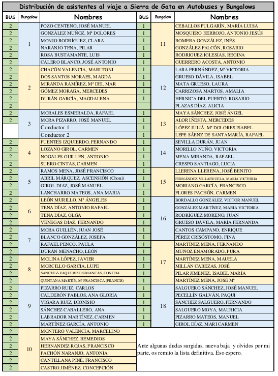 En esta tabla tenéis la distribución en autobuses y bungalows para los asistentes al viaje del fin de semana de 11 al 13 de Noviembre, en la Sierra de Gata.