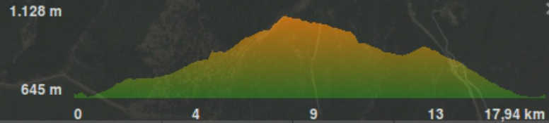 Este es e perfil de la ruta, y como se puede ver hay dos partes diferenciadas. La primera es una subida continuada, que va de menos a más, durante 8 km o poco más, y la segunda parte que es prácticmente en descenso. En total, 18 km de recorrido.