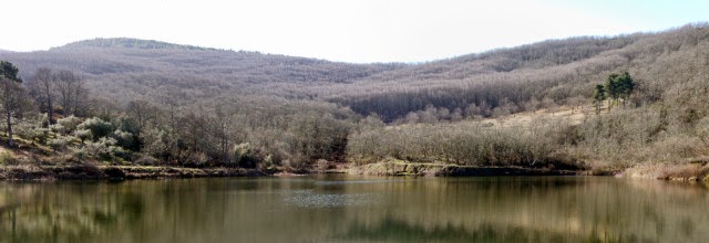 Bordearemos este pantano caminando por encima de su presa mientras nos regodeamos con las buenas vistas que tenemos a la derecha, con las aguas de este pequeño pantano que tienen como telón de fondo a la sierra cubierta completamente de bosques de hoja caduca, aunque en esta época invernal resulta ser un fondo más bien gris, tristón, con los troncos y ramas peladas de los árboles, desnudos ahora, pero con toda la pinta de ser un bosque tupido, espeso, cerrado en otras épocas del año.