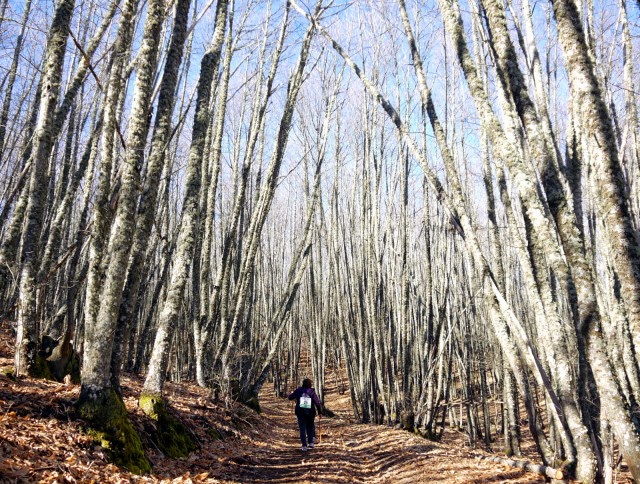 Poco a poco el camino va subiendo y nos va introduciendo de lleno en un gran robledal, robles melojos, con su típica hoja lobulada que recubre de hojarasca todo el suelo convirtiéndolo en una alfombra de tonalidades marrones y ocres, a la vez que el camino se va estrechando aún más, hasta convertirse en una senda rodeada de helechos que se adentra en la espesura del bosque, del robledal, y poco a poco, conforme vamos ganando altura, y casi sin darnos cuenta, embelesados con el recorrido, nos va conduciendo hacia otro tipo de bosque, hacia un inmenso castañar, y lo hacemos casi sin darnos cuenta, como si tan sólo hubiera una fina línea divisoria, imperceptible, invisible, entre uno y otro bosque, siendo ésta una zona muy visitada por los amantes de la micología, en busca de los boletus mas preciados