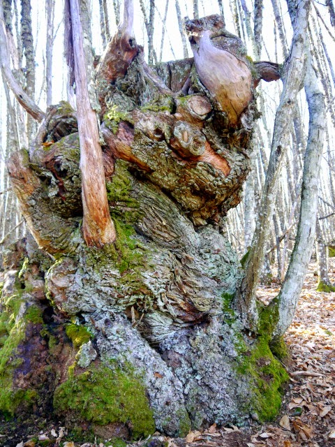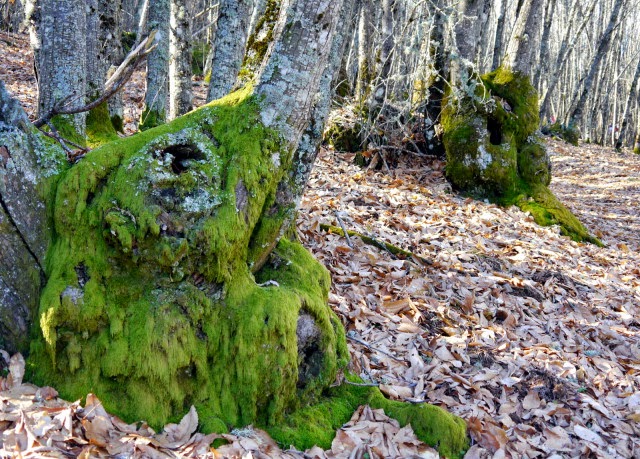 Antes de acabar este tramo de bosque de hadas, de bosque encantado, nos topamos a la izquierda del sendero con una joya, con un legendario castaño, con un tronco grueso, enorme, arrugado, plegado y vuelto a plegar, recubierto de musgo y líquenes, del que salen ramas más finas como si fueran los brazos del cuerpo que se elevan hacia arriba entonando una plegaria. Resulta tan espectacular el tamaño del tronco de este castaño, que comparándolo con los troncos del resto de árboles que lo rodean hace que éstos parezcan meros “palillos de dientes”, así que es normal que todo el mundo quiera una foto con el abuelo, con este anciano y majestuoso árbol.