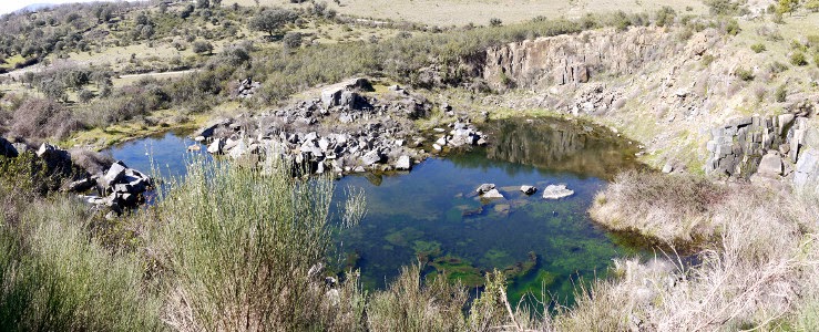 Arriba, una mini-cascada cuyas aguas alimentan la pequeña laguna que cubre la ‘Cantera’. Abajo, parte de la «Cantera» cubierta por una pequeña laguna.