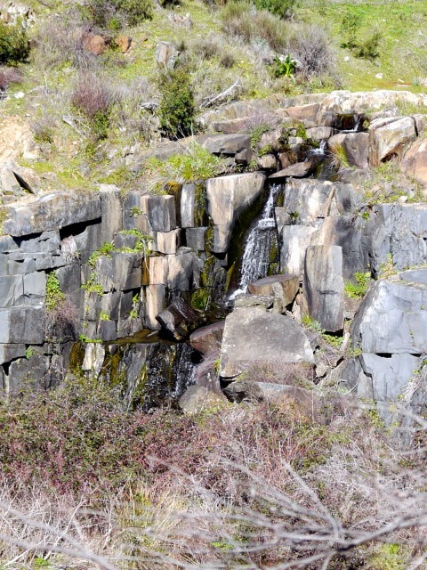 La bajada por el camino-pista, que se torna algo insulsa si no fuera por las vistas que se contemplan, acaba justo en esta cruz, junto a la carretera que va hacia Berzocana, y el recorrido por suerte, hace un giro brusco en este punto a la izquierda, dejando la pista e introduciéndonos por un camino más estrecho, de los de de “tó’la vida”, con firme más irregular, piedras, regueros, riachuelos, más frondoso, más bonito, con las vistas al fondo, de frente, de Garciaz, aunque antes de llegar tenemos que pasar por el paraje conocido como “La Cantera, en donde entre los bloques de piedra se abre paso una pequeña cascada, aunque según me contaban, esto es más bonito en épocas de lluvias…