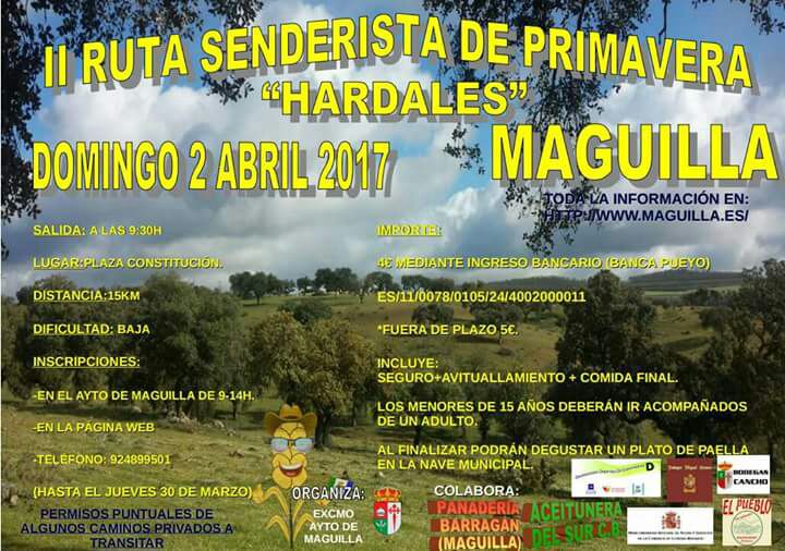 El domingo 2 de abril tenemos ruta en Maguilla, según lo previsto en nuestro calendario. Este año el Ayuntamiento de dicha localidad también ha organizado una ruta para esa misma fecha, en la que al finalizar obsequiarán a los participantes con un plato de paella, como ya conoceréis por los carteles que se han publicado. Nosotros seguiremos con nuestra planificación con agradecimiento muy especial a nuestros compañeros maguillenses, que tan gentilmente siempre nos reciben.