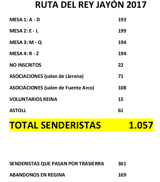 En total han sido 1.057 participantes, de los cuales, tan sólo 361 realizaron la ruta completa, entendiendo por ésta, el recorrido por la Sierra de San Miguel y el correspondiente paso por el control de Trasierra (hubo otros muchos que realizaron el recorrido hasta Llerena, pero por la «Campiña«).