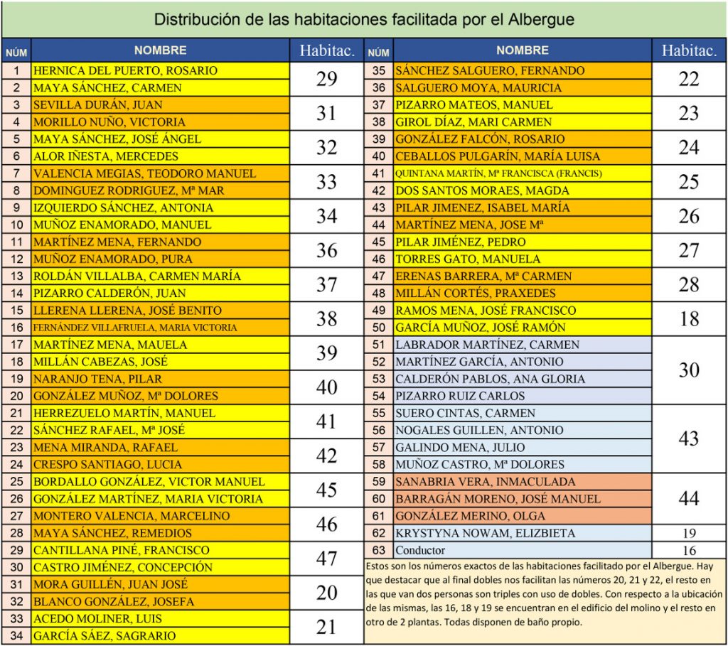 Está prevista la llegada al Albergue de El Bosque sobre las 20:00 horas. Cuando lleguemos, se realizará el reparto de alojamientos de acuerdo con la distribución que aparecerá al final de esta información, teniendo en cuenta que sólo el/la primero/a de cada habitación ha de acercarse a la recepción a recoger la llave para evitar aglomeraciones y pérdidas de tiempo innecesarias. Desconocemos cuál es la enumeración o nombre que tenga cada habitáculo, por tanto, el número que tiene asignada cada una en la lista adjunta es sólo para organización interna nuestra.
