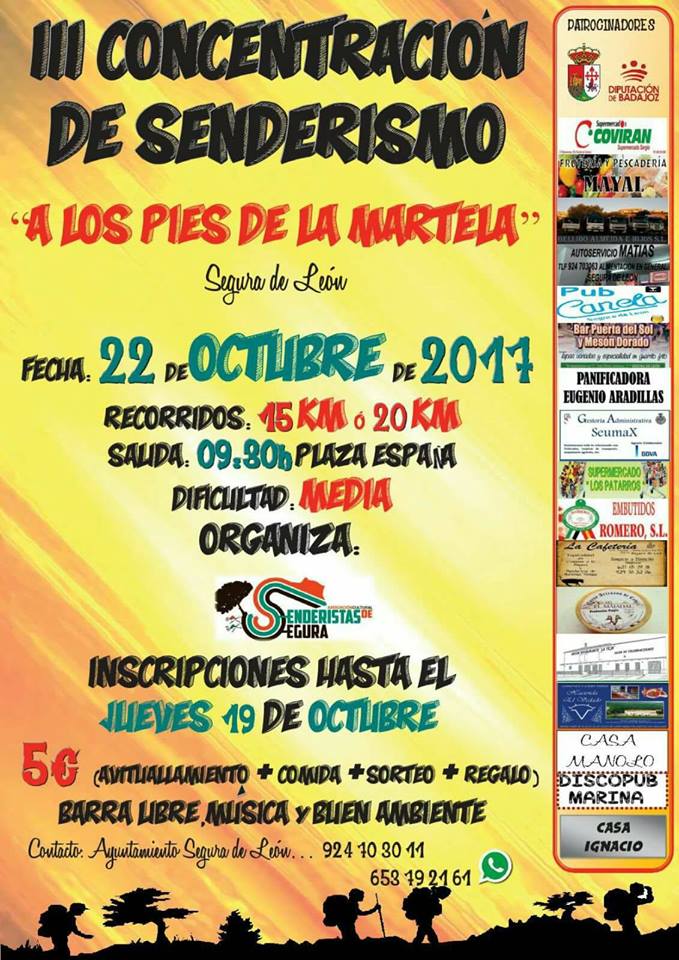 Ya se encuentra abierto el plazo de inscripción para la Ruta de Segura de León, prevista para el domingo 22 de Octubre. Habrá dos recorridos, uno largo de 18 km, y otro corto de aproximadamente 15 km. La ruta está organizada por la Asociación de Senderismo de Segura de León (adjuntamos al final de esta entrada el cartel anunciador).