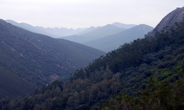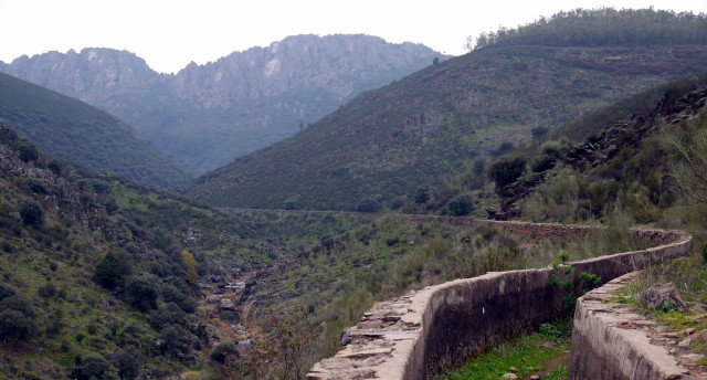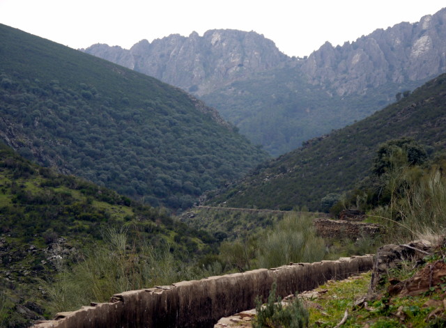 Al dejar atrás los eucaliptos, es cuando tendremos unas bonitas panorámicas de las Villuercas al fondo,  empezando a disfrutar de la ruta, rodeados de sierras a derecha e izquierda, cercanas entre ellas, y aunque no son de mucha altura, al alcanzarla bruscamente dan la sensación de que son más altas, sobre todo a medida que nos vamos introduciendo en el fondo del valle, que queda encajonado y en umbría en muchos tramos.