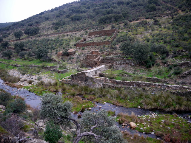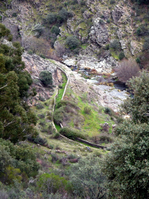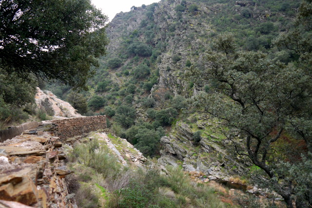 Justo al llegar a la altura de la cueva, es decir, cuando más o menos nos posicionemos bajo ella (o sea, justo cuando nos quede arriba a nuestra derecha), y una vez que ya hemos perdido casi toda la altura al bajar desde el Puerto de Deleitosa, ya podremos ver claramente a nuestra izquierda, un poco más abajo, las ruinas de la antigua herrería medieval, junto al cauce del arroyo. Junto a estas ruinas, se encuentra claramente visible el canal, por el interior del cual seguirá nuestro recorrido durante unos 5 km, guiándonos siempre por la garganta de Descuernacabras, que es por donde transita parte del recorrido de esta ruta, pero antes hay que bajar hacia el canal, sin un camino claramente marcado, tan solo guiarse por algunas sendas que salen aquí y allá y bajan hacia él, en una corta, unos 40 metros,  pero pronunciada bajada, donde hay que ir echando mano de los frenos y tener precaución de no resbalar, sobre todo si la tierra estuviera mojada.