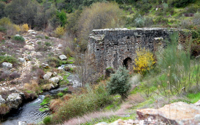 Aquí acaba el trayecto por el canal, a partir de ahora hay que dejarse llevar, porque la ruta no está marcada. Hay que bajar casi hasta el arroyo, o hasta las paredes que quedan en pie de la antigua minicentral (podemos curiosear por sus alrededores), y después seguir arroyo abajo, paralelo a éste, por estrechas sendas que aparecen aquí y allá, simplemente hay seguir por la zona más cómoda, siempre con el arroyo a nuestra derecha, paralelo a él, cruzando posteriormente otro arroyo que viene por la izquierda y siguiendo de nuevo paralelo al arroyo por el que veníamos, hasta llegar a un puente sin baranda, el conocido como Puente Viejo o Puente del Conde, aunque antes, en la otra margen del arroyo veremos las ruinas de antiguos molinos.
