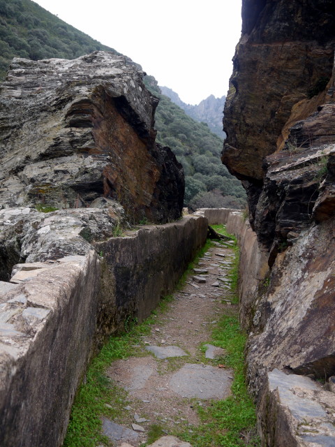 En este tramo inicial, cuando la garganta es más estrecha, es curioso ver las curvas que hace el canal, afanándose en agarrase con uñas y dientes a la ladera de la sierra por la que transita, buscando seguir la curvas de nivel, minimizando el impacto ambiental, mimetizándose, encriptándose con el entorno, algo que consigue en parte por los materiales con los que está construido, piedra y pizarra, elementos del entorno, y sobre todo cuando la capa de mortero que las recubría en los bordes superiores, la piel que lo arropaba, va desapareciendo, dejando a la luz claramente las piedras y lascas de pizarras, unas sobre otras, con las que está construido, dejando a la luz el alma del canal, y más en esta parte inicial, la más antigua, porque el canal que recorre esta garganta se divide en tres tramos, los cuales coinciden con las tres minicentrales eléctricas que estuvieron funcionando en esta zona durante el pasado siglo.
