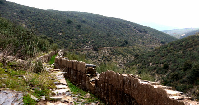 La visión del acueducto en curva, desde diferentes ángulos, es un ejercicio que no sólo es recomendable sino que yo diría que es casi obligatorio para todo el que pase por aquí, para tomar conciencia de la belleza, armonía, elegancia y ejemplo de buena construcción con materiales del entorno, saliendo del canal para verlo por fuera, tocando, palpando el grueso muro sobre el que se levantan los arcos por encima de los cuales se encuentra el canal, contemplando las vistas desde el interior de los arcos o mirando los alrededores a través de ellos, situándonos en plena curva, alejándonos unos metros de él para tener, desde el exterior, una panorámica completa, o trepando unos metros por la sierra para tener vistas desde arriba, percibiendo la fusión de este tramo de acueducto con el entorno en el que se encuentra.