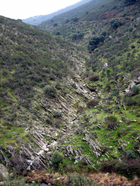 En el otro margen de la garganta, podremos ver las lascas pizarrosas verticales y oblicuas, los diferentes pliegues que dan idea del origen de estas sierras y que pueden resultar una delicia para cualquier geólogo; dependiendo de la época, se pueden ver en mayor o menor numero las pequeñas aves en los árboles más cercanos al cauce del arroyo, o al mirar atrás y con forme avance la mañana y más si ésta es soleada, podremos contemplar los buitres sobrevolando la Sierra de Juncaldilla