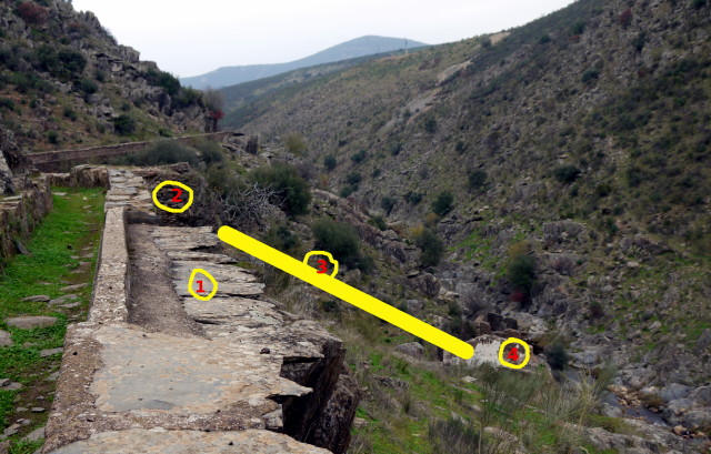 Una foto ilustrativa. El número «4» indica las construcciones-casas que alojaban la segunda minicentral eléctrica que estuvo funcionando en esta garganta, en las diferentes etapas. Ésta concretamente, fue iniciada en 1917, y por tanto, aquí acababa el canal por aquella época, con lo cual, el agua entraba en el saliente etiquetado con el número «2», el cual no tiene suelo, y a este hueco se conectaba una tubería (número «3»), por la que baja el agua hasta la central para mover las turbinas y generar electricidad. El número «1», es un deetalle de la construcción del canal, y es que en los bordes superiores de las paredes del canal se colocaban lanchas de pizarra más anchas para evacuar más fácilmente el agua sobrante, evitando deterioro de las paredes del canal. En este caso, el salto de agua podía ser de unos 10 metros, logrando producir más electricidad que la primera minicentral que hubo, construida en 1897, y que estuvo en producción durante poco tiempo.