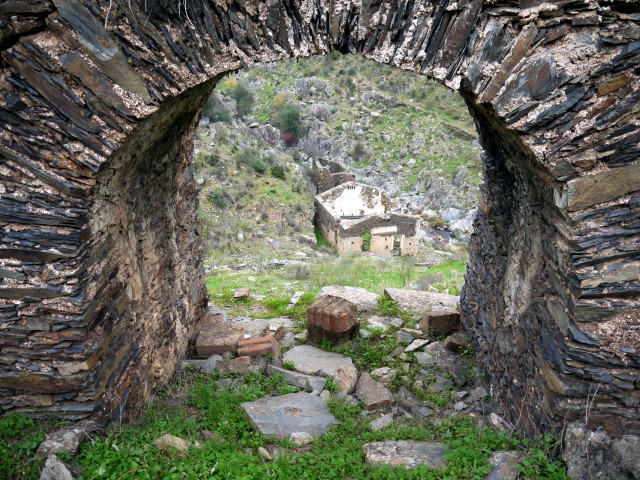 Vistas, a través de uno de los arcos del acueducto,  de las ruinas segunda minicentral que estuvo en funcionamiento en esta zona de “El Cabronil”.