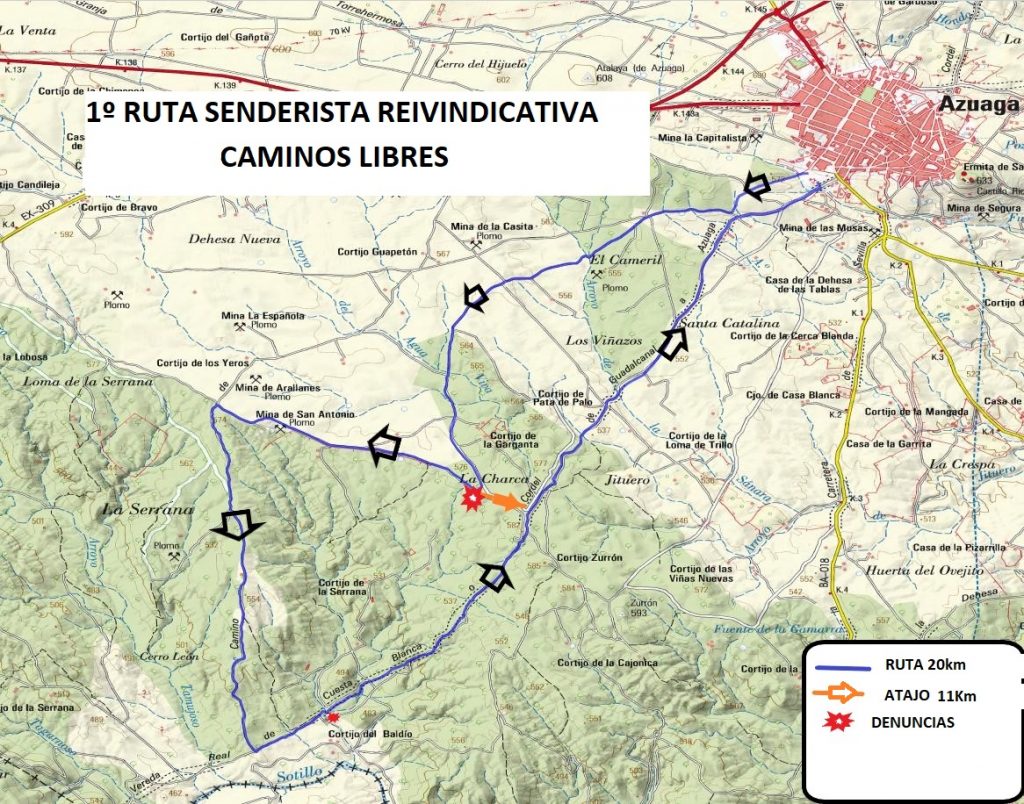 El domingo 25 de Febrero tenemos prevista la «Ruta de Azuaga«, organizada por la plataforma recientemente creada: «CAMINOS PÚBLICOS LIBRES«, de la cual nuestra asociación también forma parte, y en donde también se intengran otras asociaciones de la Campiña Sur extremeña, Sierra Norte de Sevilla y del Valle de Guadiato de Córdoba. La ruta tiene por tanto un carácter reivindicativo: ¡la lucha y defensa de los CAMINOS PÚBLICOS!, un rico patrimonio con el que contamos para el uso y disfrute de TODOS y no sólo de unos cuantos que quieren apropiarse de ellos para sus intereses particulares.