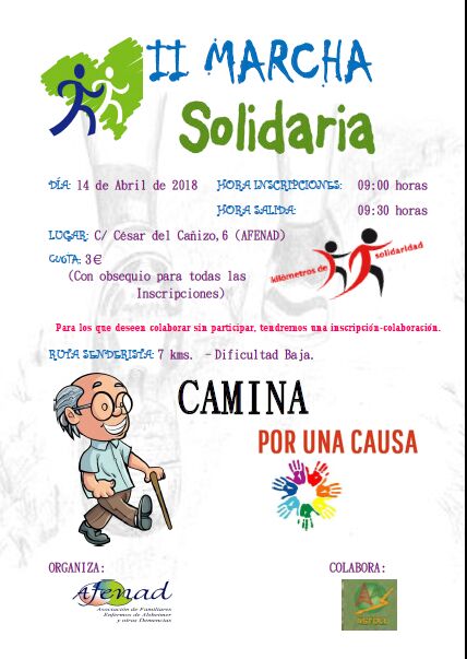 El próximo sábado, día 14, ASTOLL colabora en la ruta senderista II MARCHA SOLIDARIA que organiza AFENAD (Asociación de familiares enfermos de Alzhéimer y otras demencias). Tiene carácter benéfico y cada participante colabora al inscribirse con una aportación de 3 €, aunque también está abierta la opción de una inscripción-colaboración a quien no quiera o no pueda participar en la marcha.