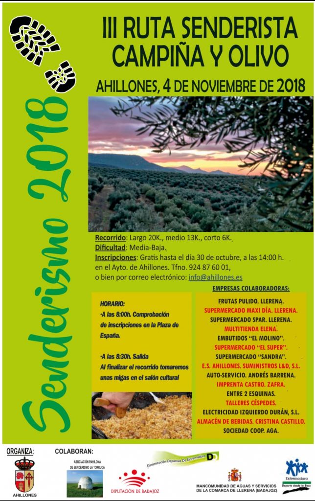 Queda abierto el plazo de inscripción para la «III Ruta Senderista Campiña y Olivo» del domingo 4 de noviembre. Esta ruta está organizada por el Excmo. Ayuntamiento de Ahillones, por lo que se encuentra sujeta a los criterios establecidos en el cartel anunciador de dicha ruta y que os dejamos al final de este artículo. Como podéis ver, el recorrido ofrece TRES posibilidades: largo de 20 kms, medio de 13 kms y corto de 6 kms, con dificultad media-baja.