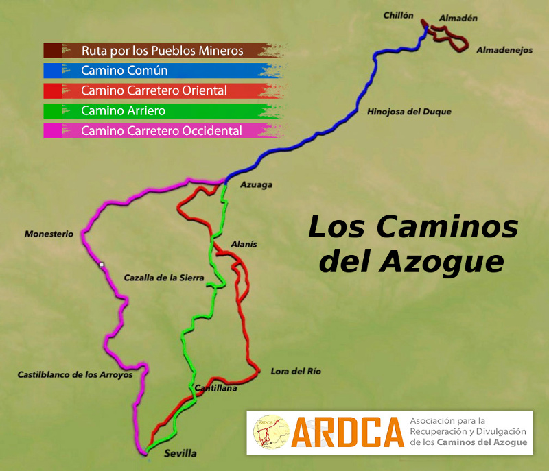 Bonito, interesante y atractivo el proyecto de ARDCA (Asociación para la Recuperación y Divulgación de los Caminos del Azogue) para recuperar, divulgar y poner en valor este Camino histórico, el Camino del Azogue o del Mercurio, así como sus distintas variantes, recogiendo la documentación obtenida tras varios años de investigación y trabajo de campo, en esta interesante web: http://www.loscaminosdelazogue.org/ en la que podremos disfrutar de toda la historia en torno a las minas de mercurio/azogue de Almadén y su entorno, de los distintos usos que tuvo, de la importancia que adquirió para la obtención de la plata en las colonias españolas en América, de los distintos caminos y sitios de paso que seguía el mercurio para ir desde Almadén a Sevilla, poblaciones, zonas históricas, etc… en definitiva, un muy interesante proyecto desde todos los puntos de vista: histórico, cultural, deportivo (para recorrer los caminos en bici o haciendo senderismo), turístico y de puesta en valor de los viejos, históricos y olvidados hasta ahora «Caminos del Azogue«.