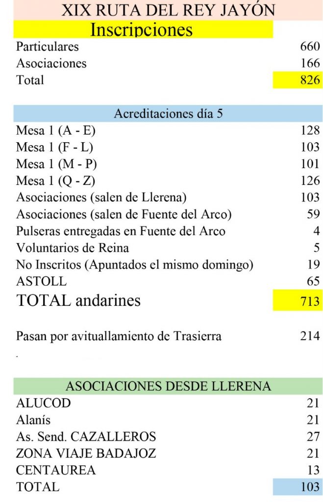 Por otro lado os dejamos a continuación los números de la ruta, en una edición marcada por el cambio de la fecha prevista para su realización como consecuencia del adelanto de las elecciones generales, lo que ha repercutido en un descenso de participantes, sobre todo a nivel de asociaciones, debido a que en la nueva fecha del 5 de mayo coincidía con otras rutas senderistas que ya estaban fijadas en los calendarios de dichas asociaciones. A pesar de todo esto, los números son más que aceptables, con 826 inscripciones previas, de las que finalmente, el día de la ruta fueron acreditados 713 (partipantes reales), siendo tan solo 214 los que realizaron la ruta larga (los que pasaron por el avituallamiento de Trasierra), o lo que es lo mismo, el 30% de los que comenzaron la ruta.