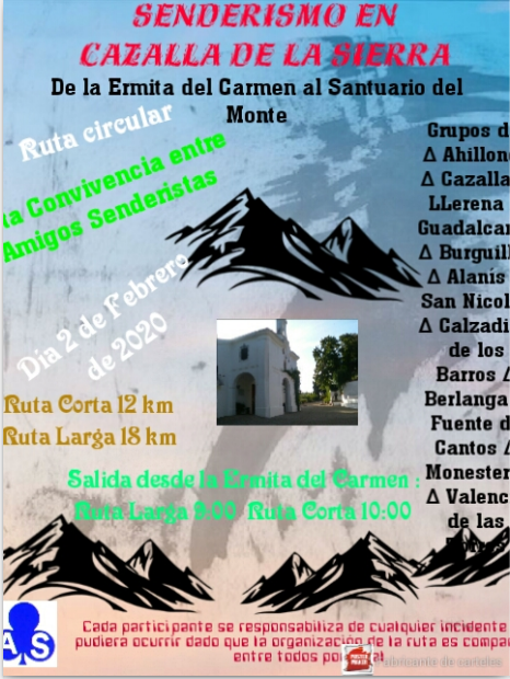 El domingo, día 2 de febrero, está prevista la «Ruta de Cazalla de la Sierra», organizada por los compañeros senderistas de dicha localidad. Os dejamos en esta entrada el  cartel anunciador de dicha ruta, recordándoos que tiene dos recorridos: largo de 18 kms, con salida a las 9:00, y corto, con inicio a las 10:00, de 12 kms. El lugar de comienzo es la Ermita del Carmen.
