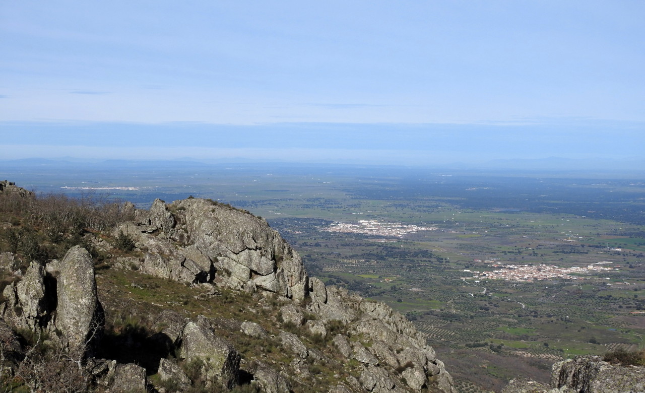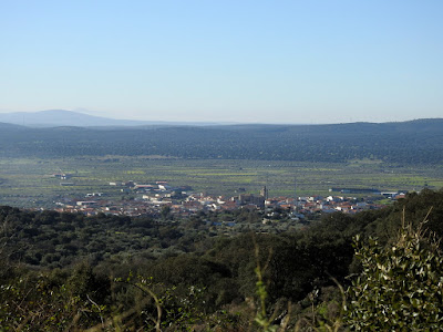 Desde la Ruta del Donde Nace, mirando a la derecha se abren vastas vistas, con Alcuéscar al fondo acompañada de la Sierra Centinela.