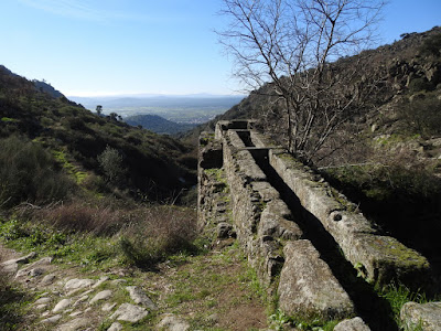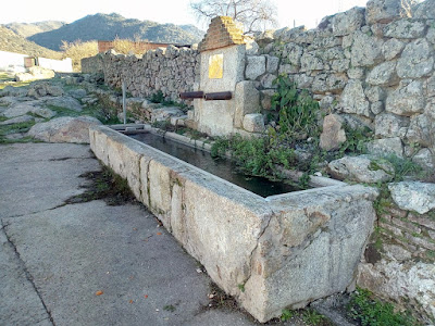 Este recorrido por la “Ruta del Donde Nace” es otro tramo muy entretenido y vistoso, en un recorrido más llano, bordeando la sierra, con zonas desde las que podemos tener unas amplias panorámicas a la derecha pudiendo observar diferentes pueblos al fondo, dispersos por el llano. En un principio el camino estrecho de tierra  se encuentra flanqueado de nuevo por paredes de piedra que delimitan las fincas, con sus antiguas puertas adinteladas que daban acceso a ellas, pero al cruzar el arroyo de los molinos por la zona donde nace, el camino cómodo y estrecho desaparece y deja paso unas veces a una senda frondosa y otras a una senda-camino empedrado, salpicado de hierba y musgo, pero con mucha menos presencia de agua de la que me  encontré la última vez que estuve por aquí, así que no es extraño que al pasar por una zona de helechos estos tengan un color marrón, casi secos y más adelante, al cruzar el arroyo el Pozón, por segunda vez, la pequeña cascada que había junto al camino, a la izquierda, se encontraba completamente seca y en la pared ni si quiera rastro de humedad, nada que ver como lo recordaba.