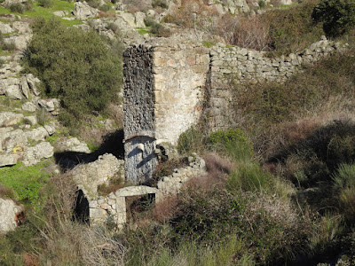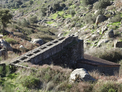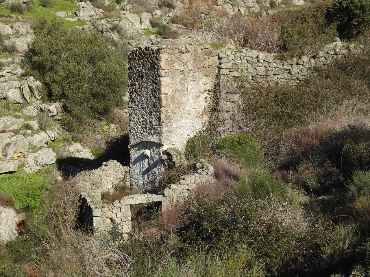 No tardaremos en llegar al primer molino, tras dejar a la derecha unas mesas merendero. Este primer molino está bastante deteriorado, al menos lo que es su ‘sala de molienda’ que está junto al camino, aunque el “cubo” y el canal o acequia por la que llega hasta él el agua se encuentran en pie, pero al estar dentro de una parcela privada, para verlo en más detalle habría que saltar la pared, algo que no es necesario porque en el transcurso de este recorrido podremos ver muchos molinos juntos al camino, todos del mismo tipo, pudiendo contemplar de cerca las distintas partes que lo conforman, si bien es cierto que entre tantos molinos y en cuanto a su estado de conservación hay un poco de todo: desde quizás los más antiguos, situados más cerca del cauce del arroyo, muy deteriorados o sólo con algunas de sus partes visibles e incluso cubiertos de zarzas y diferentes arbustos, a  los que se levantan más airosos e imponentes, en buen estado, fruto de la restauración que han sufrido por parte del ayuntamiento de Arroyomolinos de Montánchez para salvarlos del abandono progresivo, incluso en cinco de ellos, se han restaurado las antiguas ‘salas de molienda’ para servir como refugio al caminante, pero el hecho de estar tan cerca de la localidad implica que no sean utilizados para este fin, a menos que nos coja lluvia o tormenta y pueda servir para resguardarnos, porque suelen tener la puerta abierta, eso los que aún la conservan… y es que esto es también un motivo para que los gamberros de siempre hagan de las suyas con el patrimonio público, al margen de que si se decide invertir en restaurar algunos de estos antiguos molinos es para continuar después, con un mínimo coste, manteniéndolos y no abandonarlos de nuevo a su suerte. Uno de estos molinos restaurados creo que sirve de museo etnográfico, algo que me parece muy buena iniciativa.