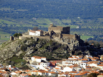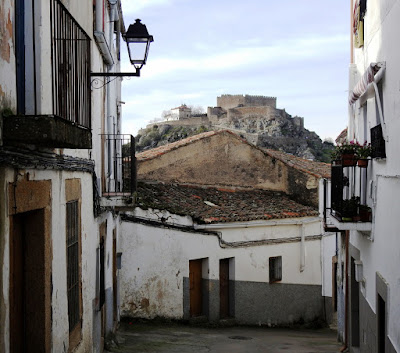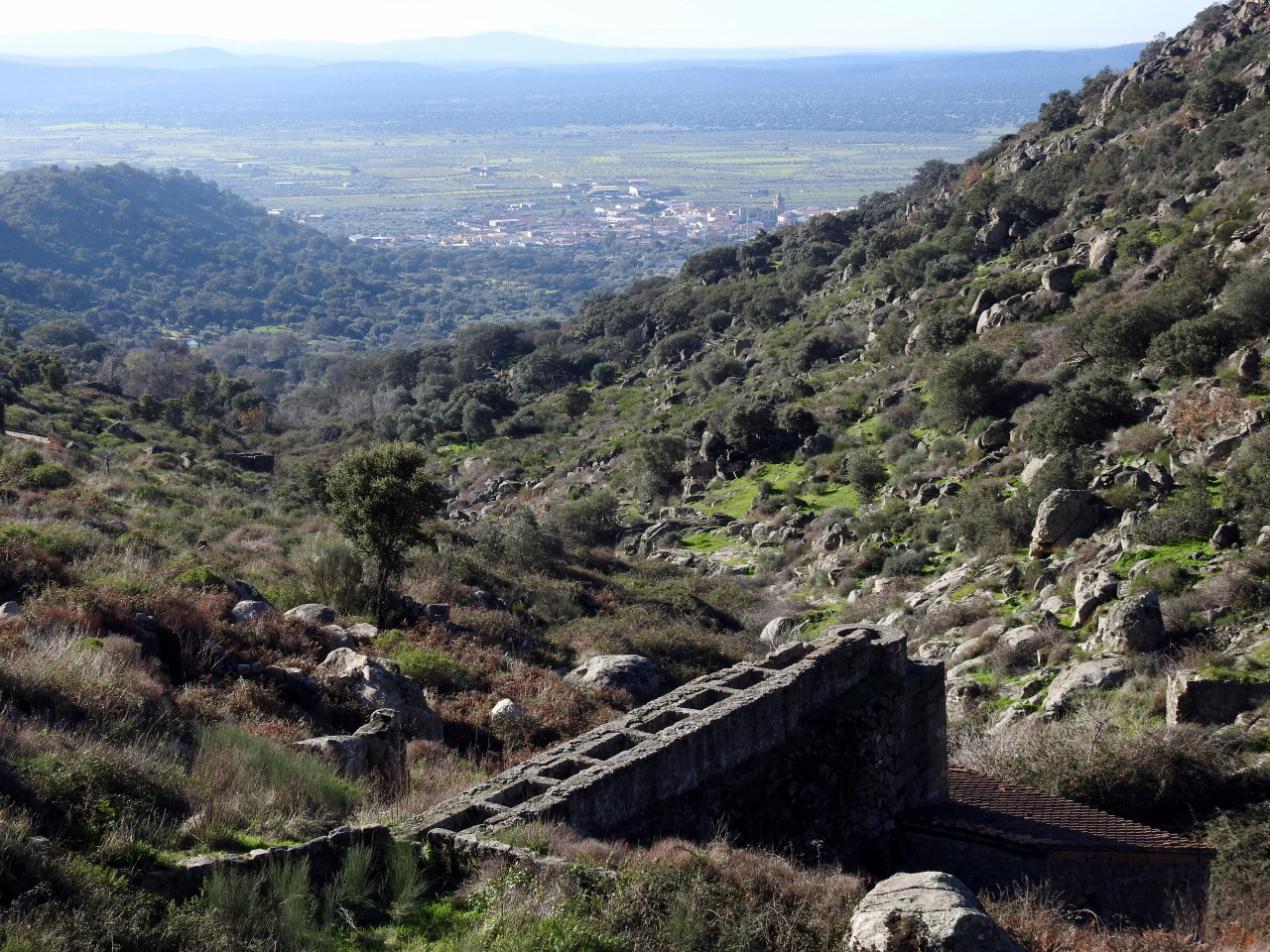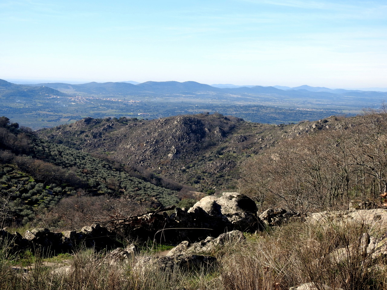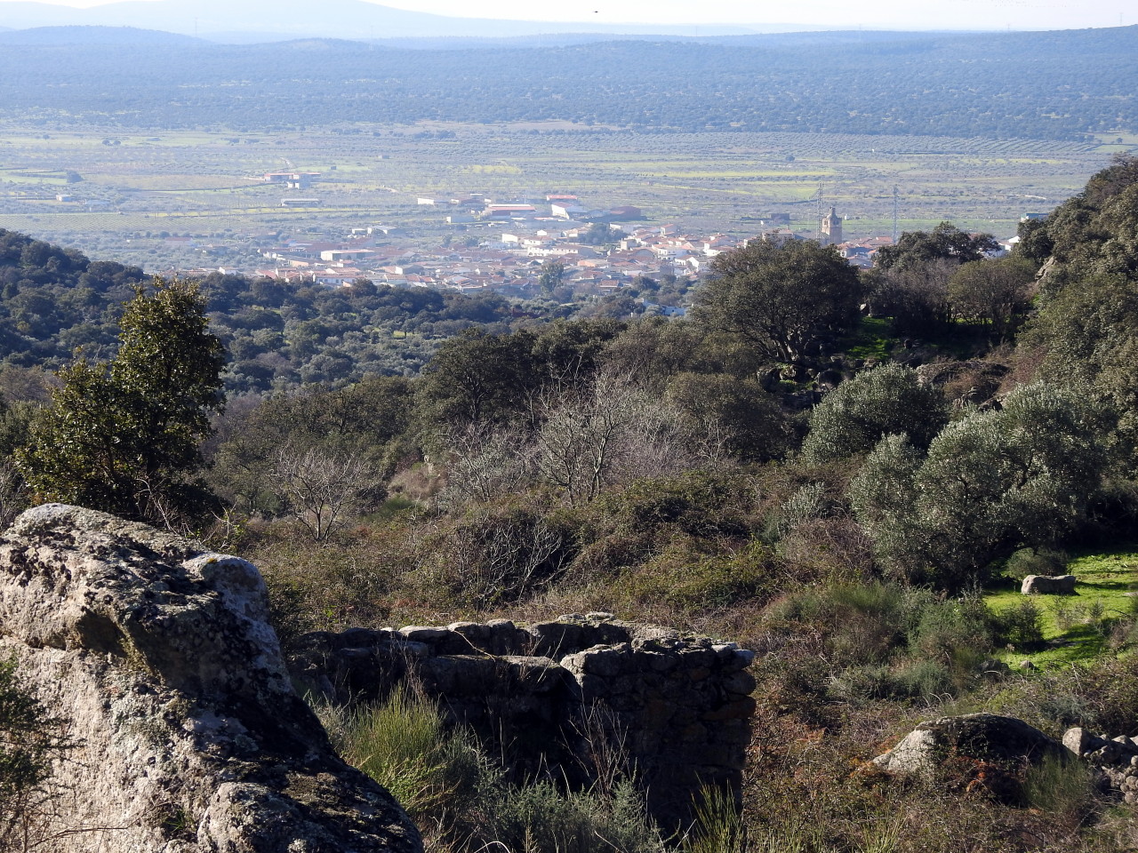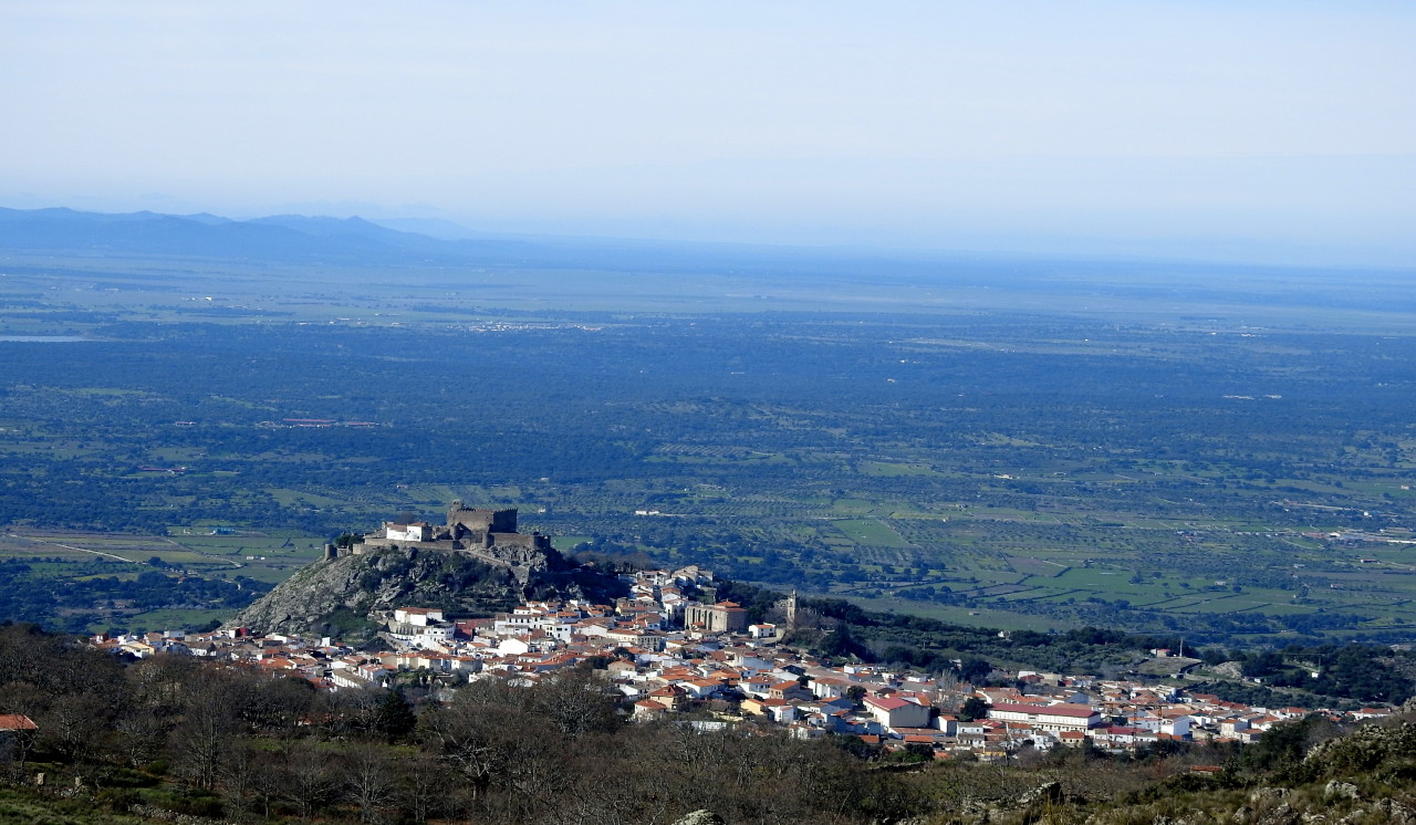 De regreso al camino que llevábamos antes de este desvío lineal, de ida y vuelta por el mismo sitio, ahora en clara bajada, se tienen buenas panorámicas de Montánchez y su castillo, así como de la zona donde se asienta.