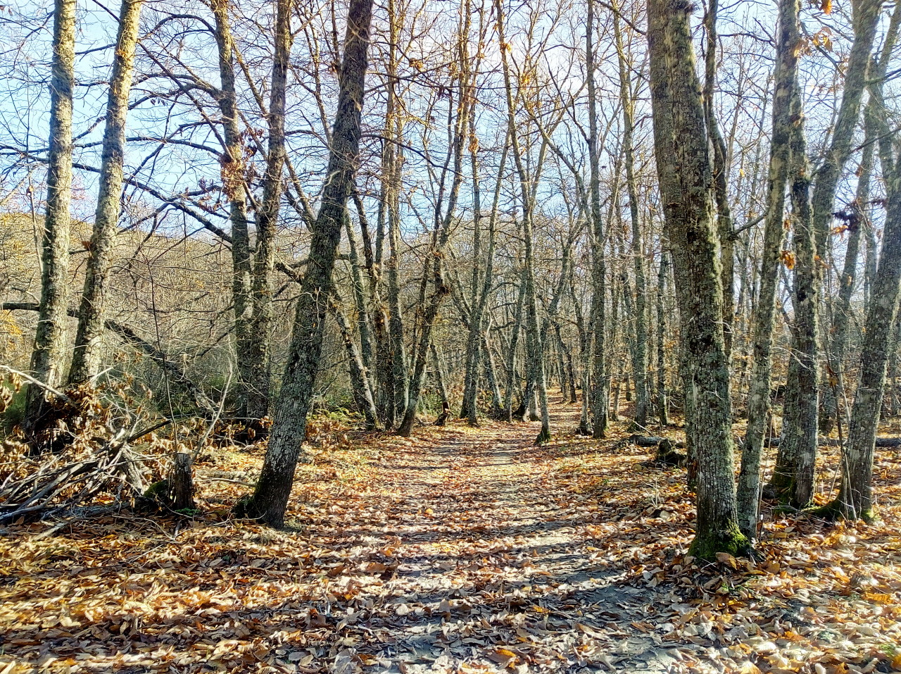 Una delicia de recorrido este tramo en descenso hasta Montánchez, en una parte final donde la bajada se hace más pronunciada, en donde hay que tener algo de prudencia puesto que la senda está empedrada y en el caso de que estuviera mojada la piedra pueda estar muy resbaladiza, por no hablar de la hojarasca que la cubre.