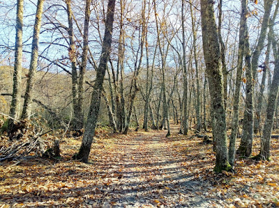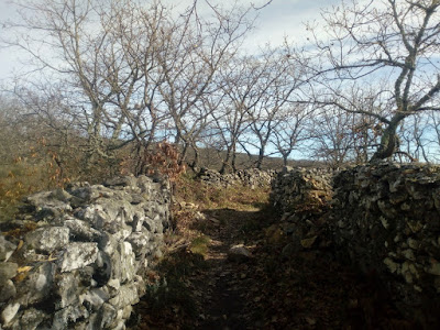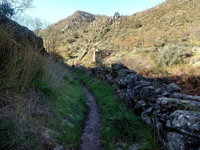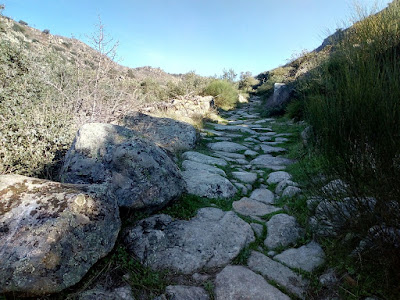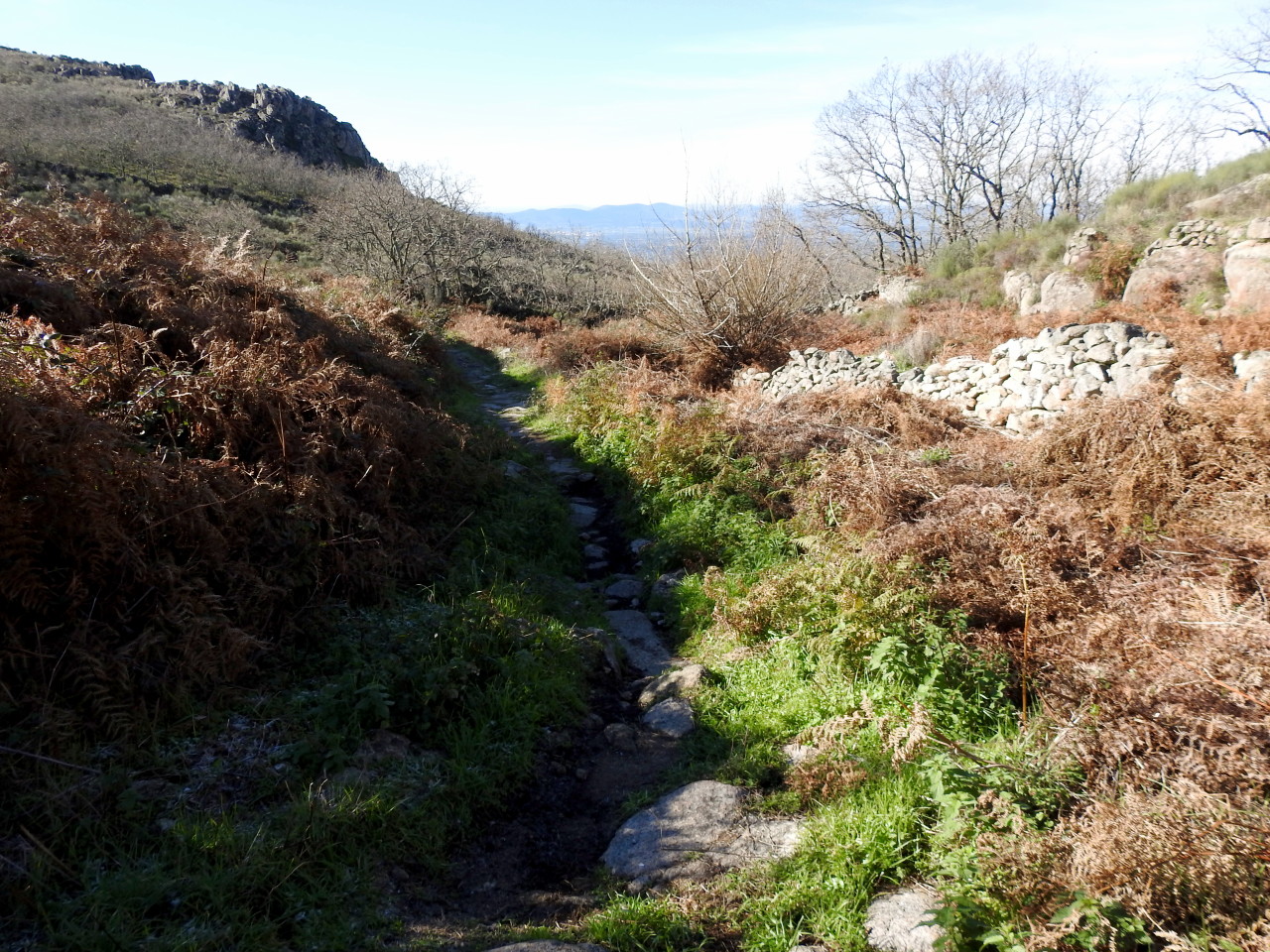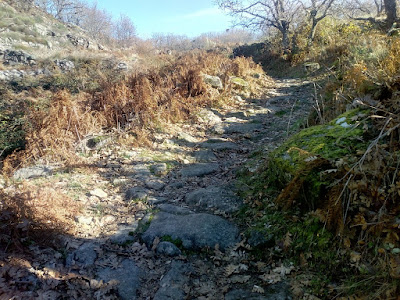 De nuevo un trayecto en bajada muy entretenido, a veces por tramos de camino empedrado un poco más amplios y en otras muchas ocasiones por senda, a veces empedrada a veces no, a veces abierta y a veces casi cerrada por la zarza, a veces seca y a veces convertida en riachuelo o inundada en cortos trayectos en los que resulta complicado no pringarse las botas de barro o agua y casi siempre rodeado de una frondosa vegetación y arboleda, lo que sin duda es una gozada de paseo.