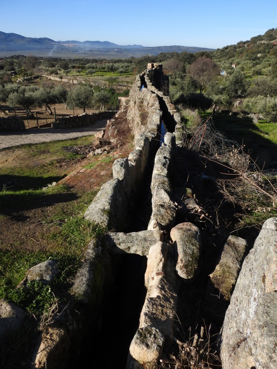 Desde el extremo de la charca se puede ver parte de todo este mecanismo comentado, viendo la acequia que conduce el agua del arroyo a la charca y como desde ésta saldría el agua por otro canal o acequia que la conduciría generalmente en línea recta durante varios metros hasta el ‘cubo‘ o pozo cilíndrico por el que caería. En muchos de estos molinos, podemos ver siempre al fondo, siguiendo la línea recta de la canal y el cubo, el pueblo de Arroyomolinos, en el llano y es que la ruta nos lleva del llano a las alturas de la sierra donde se alojan las antenas de comunicación visibles desde bien lejos.