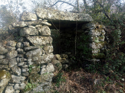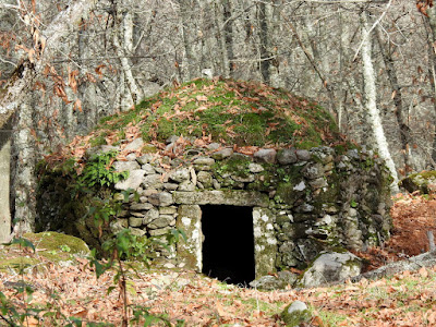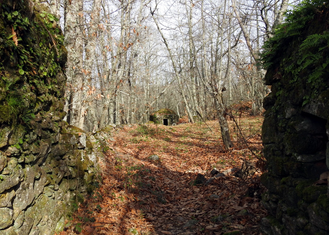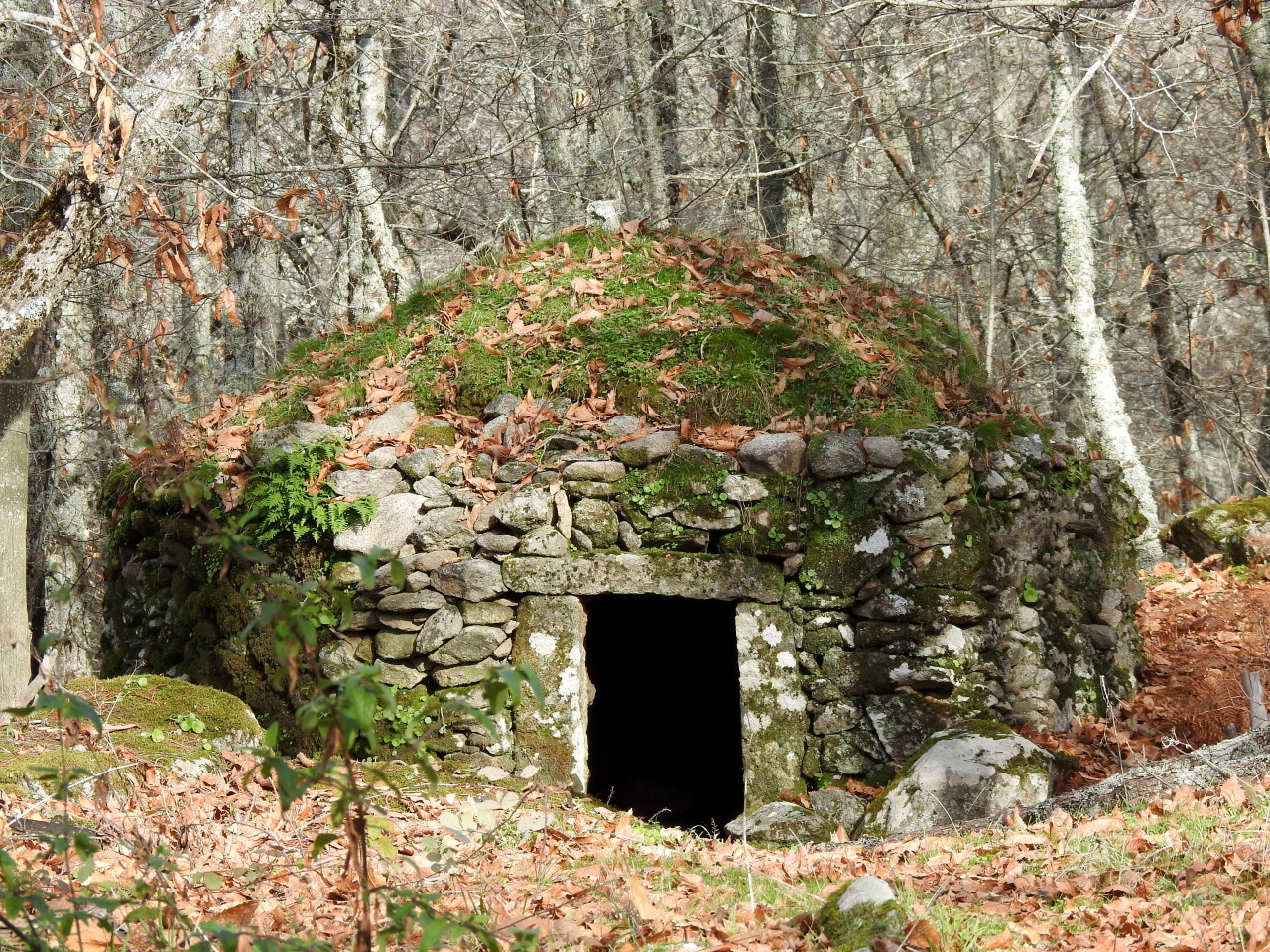 Es en este último tramo de bajada por camino-senda en completa umbría y con mucha humedad, donde se puede ver a la derecha, por el hueco que dejan las paredes de piedra que delimitan las fincas, a modo de puerta de entrada, un antiguo chozo de piedra, muy fotogénico él, en donde contrasta el manto de colores ocres de la hojarasca con el gris de la piedra recubierto de musgo que le dota de un verde intenso, rodeado de los troncos desnudos de los castaños que a modo de guardaespaldas parecen protegerlo…