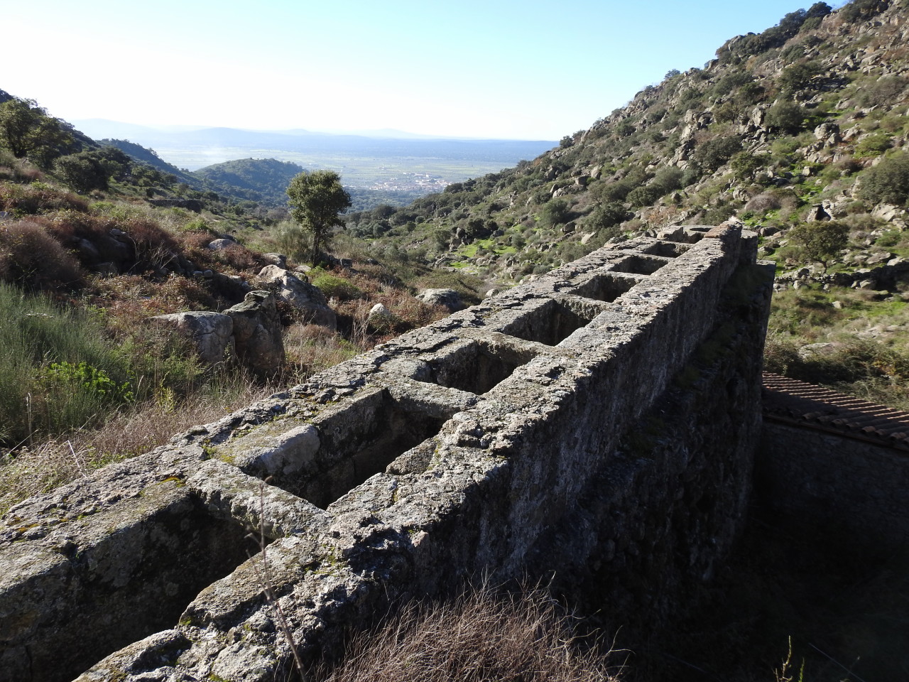Restos un molino: parte de la canal y el ‘cubo’, con el pueblo de Arroyomolinos al fondo.