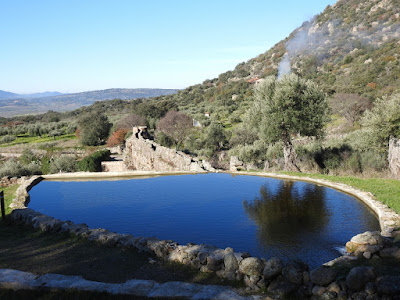 Cerca de la fuente existen varios paneles informativos sobre algunas rutas senderistas que se pueden hacer desde allí, incluida ésta de la “ruta de los molinos”, con un recorrido por la garganta del mismo nombre que nos llevará hasta Montánchez y en donde según leí, llegaron a existir hasta treinta molinos harineros, algunos de origen romano aunque la mayoría de los que podremos ver son del siglo XIX y de principios del siglo XX.