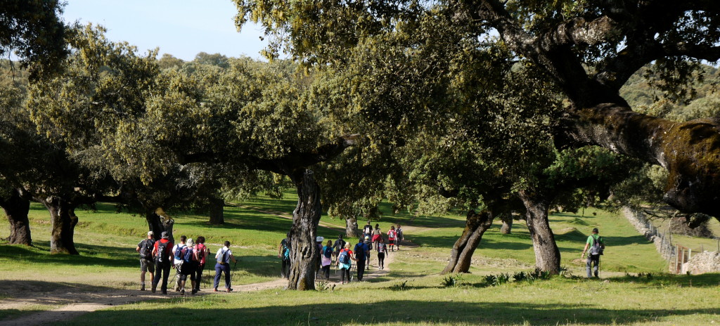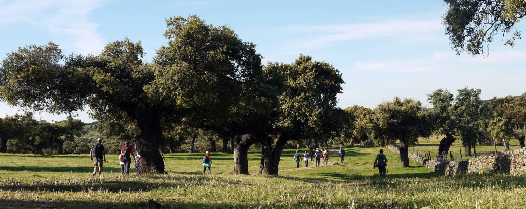 No tardaremos mucho tiempo en adentrarnos en una espesa dehesa con árboles centenarios, perfectamente conservados, siendo un placer caminar en medio de ella, en esa paz especial que rodea estos bosques de encinas y alcornoques, viendo algunos rebaños de oveja o vacas completamente a su aire y algunas antiguas construcciones de piedra, ahora en desuso, para pastores y ganado.