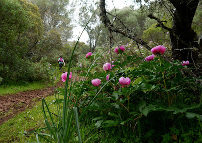 Tras las fotos de rigor, deshacemos el camino andado para proseguir con la ruta que llevábamos y si han empezado a florecer las peonías, desde este punto y hasta la cima de la sierra ya podremos ir viéndolas, bajo la sombra de cualquier árbol, al principio de forma aislada o en pequeños grupos, pero no es necesaro que nos volvamos locos haciendo fotos con las primera que se vena porque si están florecidas, más tarde, en al última parte de la subida a la sierra, podremos disfrutar de un «mar de peonías«…