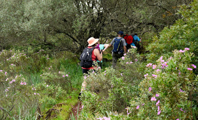 El camino se va estrechando más y tras pasar una zona de umbría y de sendas, dejando atrás el primer panel informativo de la ruta, llegaremos a una bifurcación que hace que esta parte de la sierra se convierta en un recorrido circular, así que podríamos subir indistintamente por cualquiera de los dos lados y bajar después por el contrario, aunque nosotros nos decantaremos por subir por el lado derecho, por un camino en subida, como no podía ser de otro modo, pero muy llevadera, rodeados completamente de vegetación, en algunos casos envueltos en auténticos túneles formados por ésta y si hay suerte, encontrándonos a ambos lados de la senda con la bonita y colorida rosa de alejandría en flor.