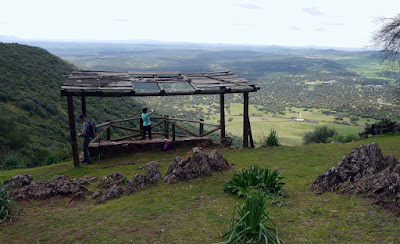 La senda nos acaba llevando a la parte más alta de la sierra, donde se encuentran unas mesas merenderos, un vértice geodésico y un torreón que hace las funciones de mirador, desde el cual se tienen unas vistas espectaculares en 360 grados, desde enormes dehesas con sus respectivos cortijos, a diferentes pueblos, incluido Olivenza, a uno y otro lado de una frontera marcada por el río Guadiana.