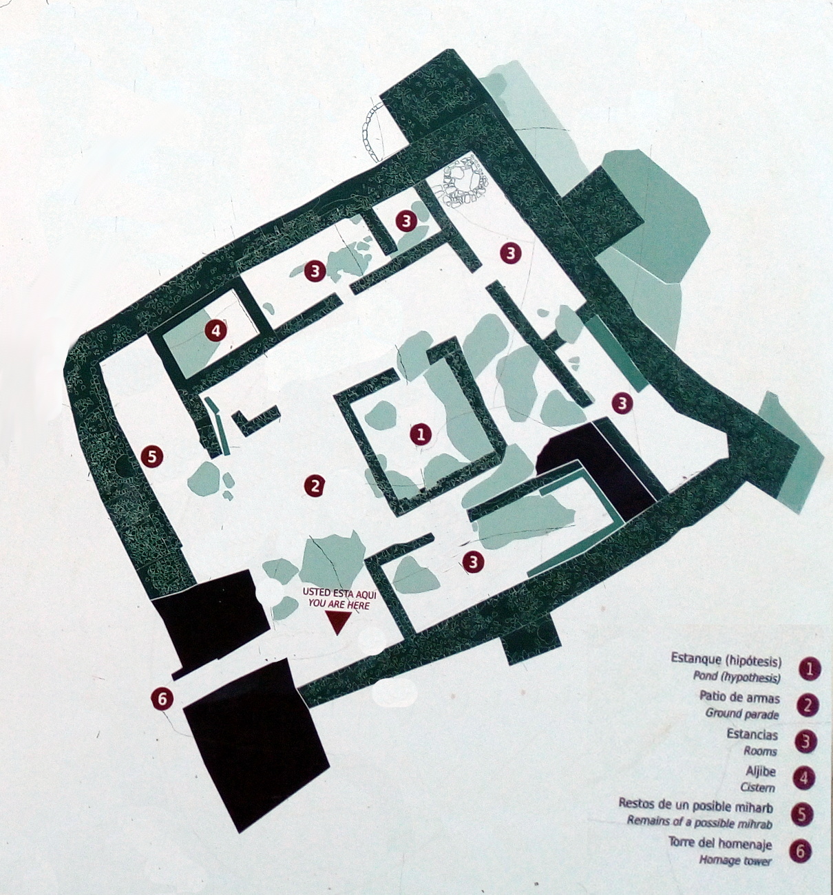 El interior del recinto principal del castillo es de forma cuadrangular, con un estanque en el centro y habitáculos por los laterales, incluido los restos de un aljibe.