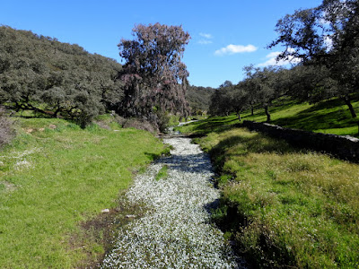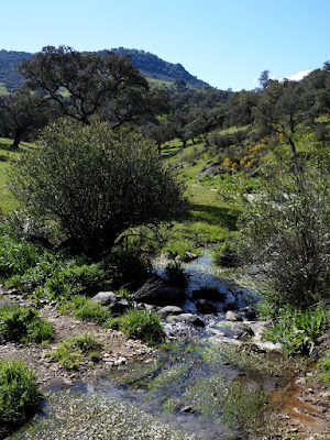 Un paseo tranquilo, donde el firme inicial de hormigón acaba dejando paso a un camino amplio que más tarde se estrecha, entre encinares y sierras que conservan su esencia, pasando por alguna explotación porcina junto al camino y cruzando un par de riveras por pequeños puentes y justo al dejar atrás el último de ellos, es cuando se inicia tras hacer un giro a la izquierda, la subida al castillo.