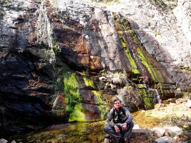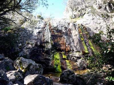 Tras cruzar en un par de ocasiones el arroyo y entre dos farallones verticales que provocan un mayor estrechamiento de la zona, por fin llegaremos, al cabo de unos cinco kilómetros, cortos en distancia pero muy entretenidos e intensos en tiempo, a la “Chorrera de Calabazas”, un salto vertical de unos diez metros con una pared cromática producto de la humedad, con los verdes en la parte baja, y los tonos negros y rojizos más arriba, pero agua… dependerá de lo que hubiera llovida en días previos, porque cuando yo estuve… lo que se dice agua caer, poca, dos chorros por separados que caian con gran parsimonia a un charco de aguas cristalinas y por rebose, seguirán abriéndose paso entre canchales y piedras hacia abajo…