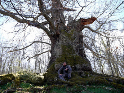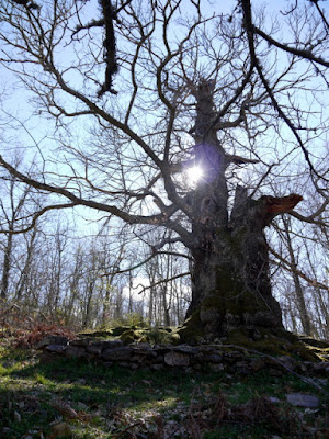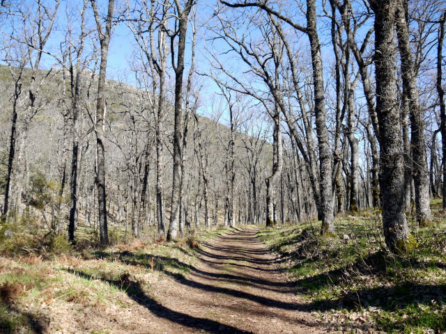 Desde el Collado de Postuero, lo que sigue es un descenso suave, algo más brusco al principio pero muy suave después, caminando de lleno por otro tipo de bosque, donde los castaños han sido sustituidos por un rebollar, o sea, por un bosque de robles melojos (Quercus pyrenaica), sólo hace falta ver en el suelo sus hojas ocres lobuladas que lo delatan fácilmente, una pena no poder ver esto con el colorido especial del otoño, pero es lo que hay.