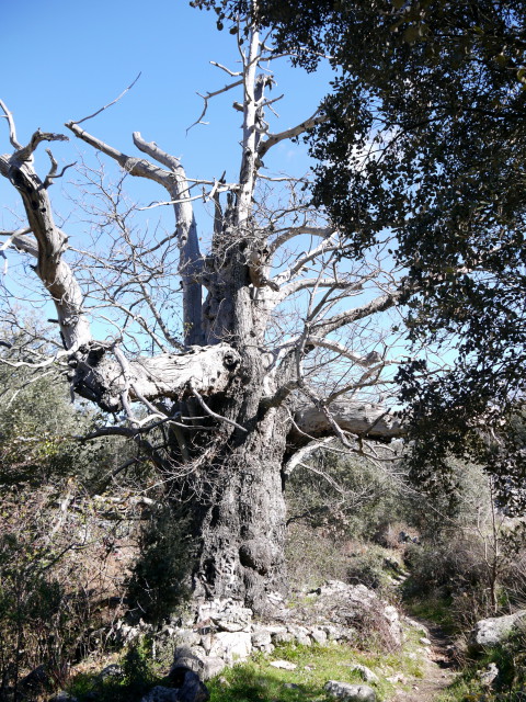 Los que deseen seguir hacia delante, emprenderán un descenso inicial algo más fuerte que el realizado desde el Collado de Postuero, por zona muy arbolada y senda estrecha, de piedras, más irregular, en un trazado que llevará al arroyo o Garganta de Calabazas a nuestra izquierda, pero del que iremos separándonos levemente, hasta llegar a realizar un brusco giro a nuestra izquierda (dirección noreste) que nos llevará a cruzar la Garganta (habrá que ver como va de caudal) para terminar por dejarla a nuestra espalda, momento en el que el recorrido se volverá mucho mas suave, casi llano, donde la senda por la que bajábamos se transformará en camino más amplio, al tiempo que la zona boscosa dejará paso a una zona más abierta, donde aparecerán algunos pequeños olivares. Avanzando un poco más por este terrero llano tendremos que cruzar otro arroyo, el arroyo del Gollicio.