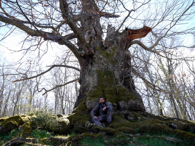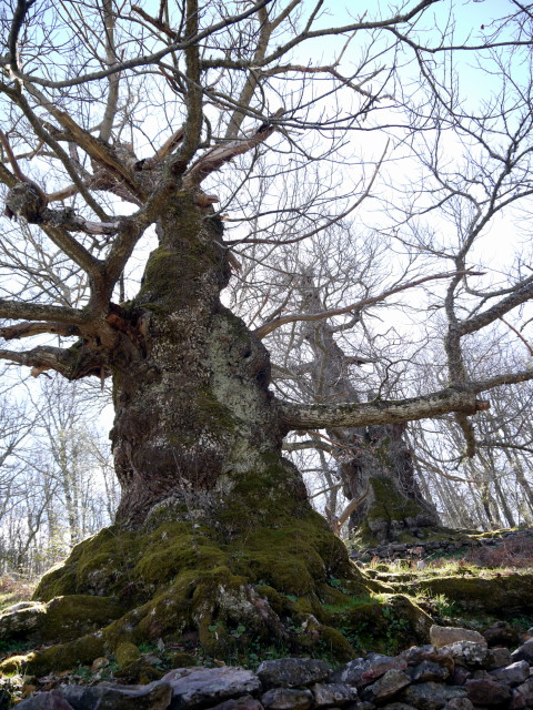Esta primera parte del recorrido es un paseo bonito y muy entretenido, por camino en suave subida que transcurre en mitad de un bosque de castaños, la lástima es que en ésta época de invierno no se puede disfrutar de las típicas tonalidades otoñales del bosque o de su marto verde frondoso de época primaveral mientras escuchamos el trino de los pájaros, aunque por otro lado, la desnudez de los árboles hace que sea más fácil ver al pájaro «pico picapinos» (Dendrocopos major), uno de nuestros pájaros carpinteros, aunque antes de verlo seguro que podremos oir el típico martilleo de su pico con los troncos de los árboles.