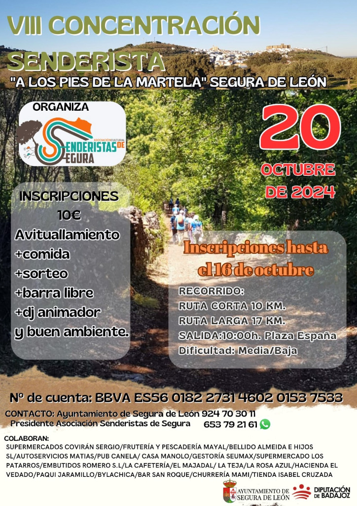 Queda abierto el plazo de inscripción para la VIII Concentración Senderista: «A los pies de la Martela», en Segura de León, del domingo 20 de octubre.. Se trata de una ruta organizada Asociación de Senderismo de Segura de León en la que habrá dos recorridos, uno de 10 y otro de 17 km, con dificultad media/baja.