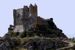 Hechas las fotos de rigor, y tras regodearnos con las vistas, toca bajar a este pueblo medieval de poco más de dos calles, de casas y calles de piedra que se mimetizan con el entorno y del que apenas desentona el rojo de sus tejados reformados. Allí nos espera de nuevo el bus, porque aquí finalizarán la ruta algunos, mientras que para otros es justamente donde la comenzarán. Visitamos el pueblo y su castillo, o mejor dicho, la grandiosa y ruinosa torre del homenaje que es prácticamente lo que queda en pie en ese cerro en cuya falda se asienta el pueblo y una ermita. Desde la ladera del castillo se tienen unas buenas vistas panorámicas del pueblo por completo y del entorno que lo rodea, así como del pequeño cementerio situado bajo los muros de la torre, además de las tumbas antropomorfas de los alrededores.
