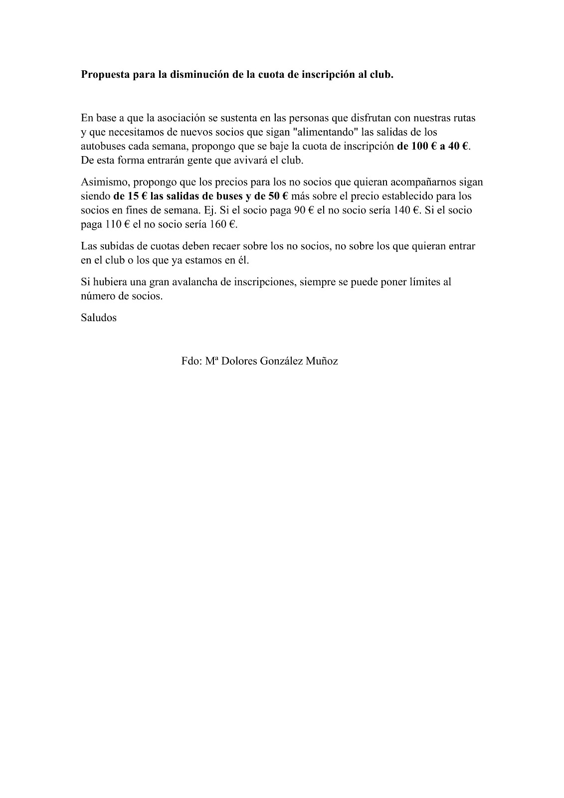 7. Propuesta presentada por la socia Mª Dolores González Muñoz: Modificación de la cuota de inscripción para que pase de los 100€ actualea a 40€. Por otro lado, propone también la modificación de la demasía que tienen que pagar los NO socios en viajes de fines de semana, para que pasen a pagar de los 20€ actuales a 40 €.