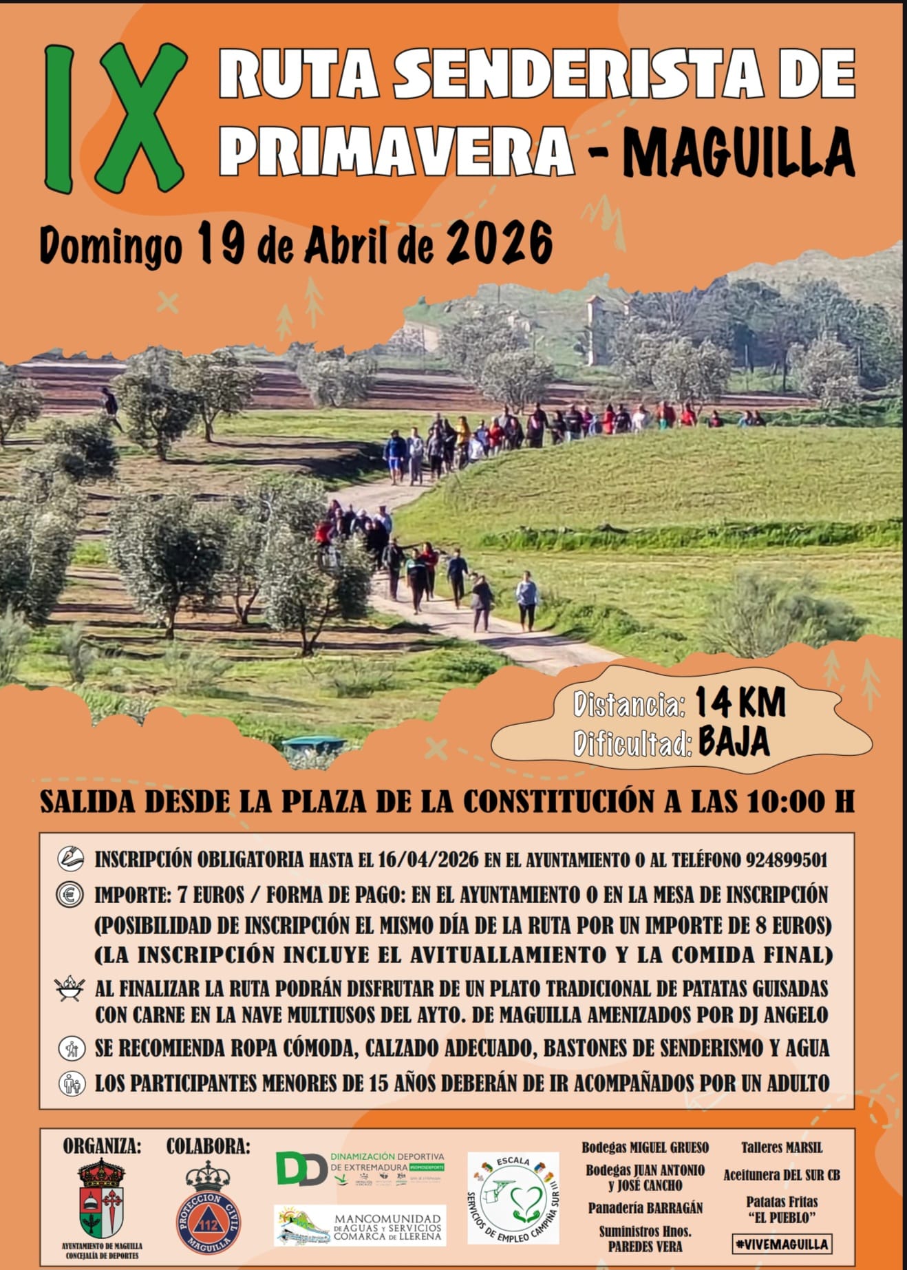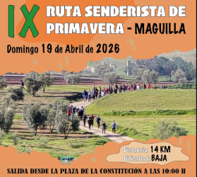 Queda abierto el plazo de inscripción para la ruta de Maguilla, prevista para el domingo día 19 de abril. El Ayuntamiento de dicha localidad lleva el peso de la organización de la misma, la cual incluye: seguro, avituallamiento y comida al finalizar el recorrido, además del acompañamiento musical, tal y como se indica en el cartel que os dejemos al final de esta entrada.