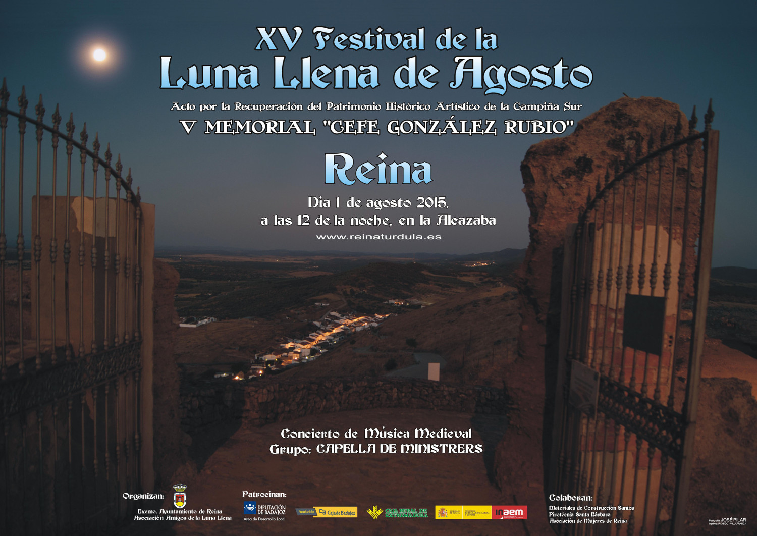 El sábado 1 de agosto se celebrará en Reina el XV Festival de la Luna Llena de Agosto, acto por la recuperación del patrimonio histórico artístico de la Campiña Sur, V MEMORIAL «CEFE GONZÁLEZ RUBIO», y como queda señalado en la parte inferior de nuestro calendario anual, a las 8’15 se realizará la salida desde Llerena (desde el lugar habitual, el «Bar Soga«) de la ruta nocturna que nos llevará primero a Reina y después a su Alcazaba, donde tendrá lugar, a las 24 horas, el concierto de música medieval a cargo del grupo «Capella de Ministrers», al que seguirá una quema de fuegos artificiales.